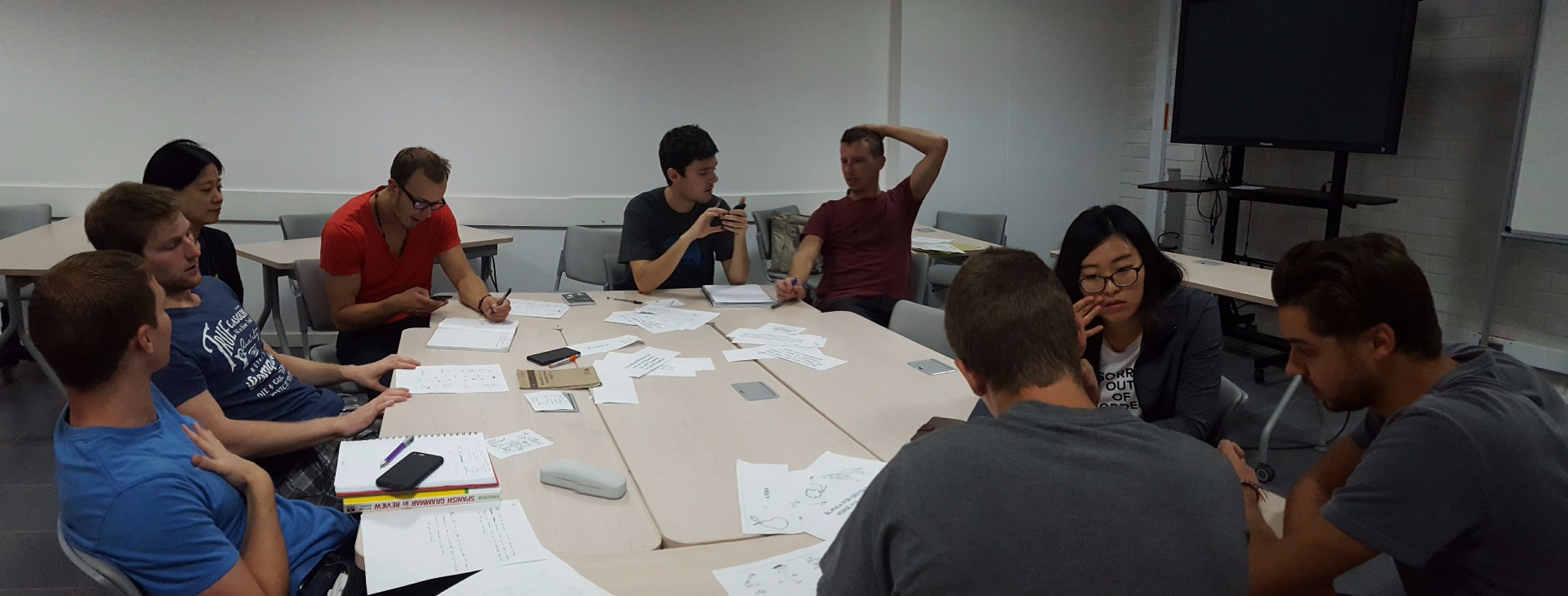 La asistencia, suele ser muy variada en el club de conversación, pues es de comprender que muchos extranjeros viajan en repetidas ocasiones para conocer lugares muy populares y turísticos de Colombia, es por esta razón que siempre tenemos diferentes personas del club. Es decir, todo el tiempo llegan nuevos participantes. Por esa razón en esta ocasión, implementé nuevamente el juego de las sílabas como ejercicio inicial para desarrollar en grupo, seguido jugamos pictionary dibujando las palabras, y finalmente divido en 2 equipos les repartí una las mismas palabras a cada grupo para que crearan una historia con la ayuda de las preguntas ¿quién?, ¿qué?, ¿cuándo?, ¿dónde?, ¿porqué?, y ¿cómo?