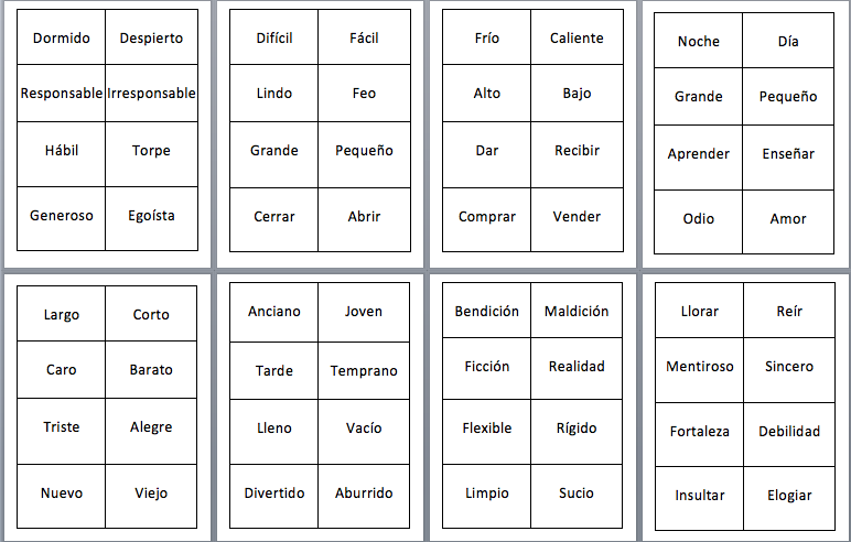 En esta sesión propuse varias actividades con el objetivo de aprender sobre sinónimos y antónimos. De manera grupal, empezamos con el apareamiento entre las palabras, después divido en 2 equipos en forma de competencia, continuamos con el juego de tabú que consiste en describir la palabra que está en color azul o rosado sin mencionar las que están en la lista de la tarjeta, y finalmente el juego ¿quién quiere ser millonario?