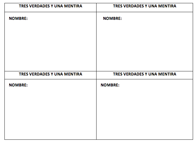 Cada participante debía escribir 3 verdades y 1 mentira acerca de sí mismo, luego se entregaban aleatoriamente las tarjetas en todo el grupo, cada uno tenía la de otro compañero y debían adivinar cual era la mentira del autor.