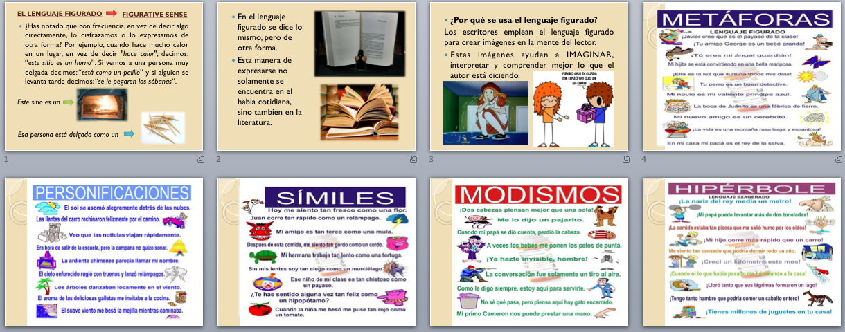 Inicialmente, se mostraron las presentaciones con ejemplos de frases con sentido figurado, lo anterior brindó la oportunidad de explicar a groso modo las metáforas, las personificaciones, los símiles, los modismos y la hipérbole. Cada uno debía leer un ejemplo y decir que habían comprendido o que quería decir la frase.