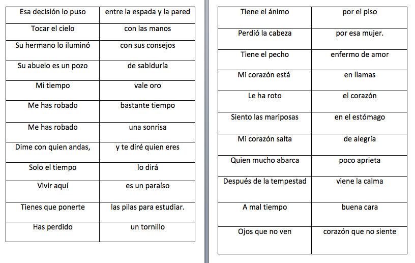 Al final, se les entregó cada uno un paquetico de las partes de una frase con sentido figurado y después debían buscar entre ellos el complemento correcto de sus frases. Esta actividad permitió conocer mas sobre vocabulario y frases no literales; asimismo ellos expusieron como se decía esa misma frase en su idioma.