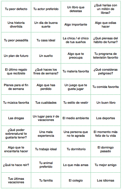 El juego de "Pregúntale a la clase" consistía en encontrar un compañero que realizara alguna actividad de los recuadros y al final se comentaron todos los resultados en el grupo. Lo anterior, permitió que se conocieran un poco mas entre ellos.